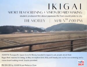 ASAM 179I Transpacific Japan: Love & Money class traveled to Japan to ask people about their Ikigai, their reasons for being. In this, we explore love, duty, and beauty. Join us for our screening and a vision board making event. Snacks provided.