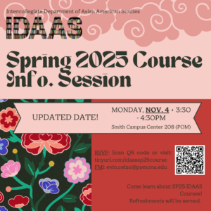 We are having our Spring 2025 Course Info Session on Monday, November 4, from 3:30-4:30pm in Smith Campus Center room 208, Pomona College. Come learn about the IDAAS courses offered this coming spring 2025. Refreshments will be served. Please use QR-code to RSVP. For more information, contact Cogie Celzo.