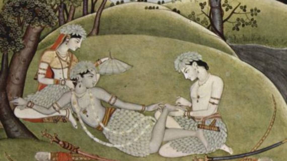 Rama, Sita, and Lakshmana in a forest after their exile, from the Ramayana, manuscript from ca. 1780.