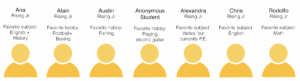 The seven rising juniors who volunteered their answers to the following questions, and their favorite subject or personal hobby.