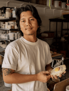 Reniel Del Rosario (b. Iba, Philippines) uses ceramics, quantity, and satire to discuss themes of commodification and value. His projects range from interactive mimicries of consumer establishments, to reimaginings of artifacts, to imperfect copies of already-existing objects. He holds a BA in Art Practice from the University of California at Berkeley. He is a 2019 recipient of the Center for Craft’s Windgate-Lamar fellowship, a 2022 SFMOMA Artists Soapbox Derby racer, and has been featured in writings such as ARTFORUM and Bon Appetit. His work has been exhibited internationally through traditional and alternative venues such as West Coast Craft, Meta Open Arts, the Contemporary Art Museum St. Louis, Catharine Clark Gallery, the 79th Scripps College Ceramics Annual, Load Na Dito, San Francisco Art Fair, Praise Shadows Art Gallery, the San Francisco Museum of Modern Art, Jane Lombard Gallery, and simply on the public sidewalk. Del Rosario was an artist-in-residence at the American Museum of Ceramic Art (AMOCA) in Pomona, CA from September 2024–August 2025.