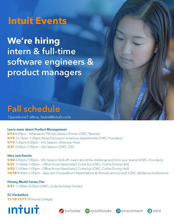 Come learn about these innovative programs from Intuit engineers, design thinkers, and product managers. Hear first-hand experiences from 5C alum on how they engage with the process of design thinking to take groundbreaking products from idea to reality at Intuit, the leading technology company behind turbotax, quickbooks, and mint.