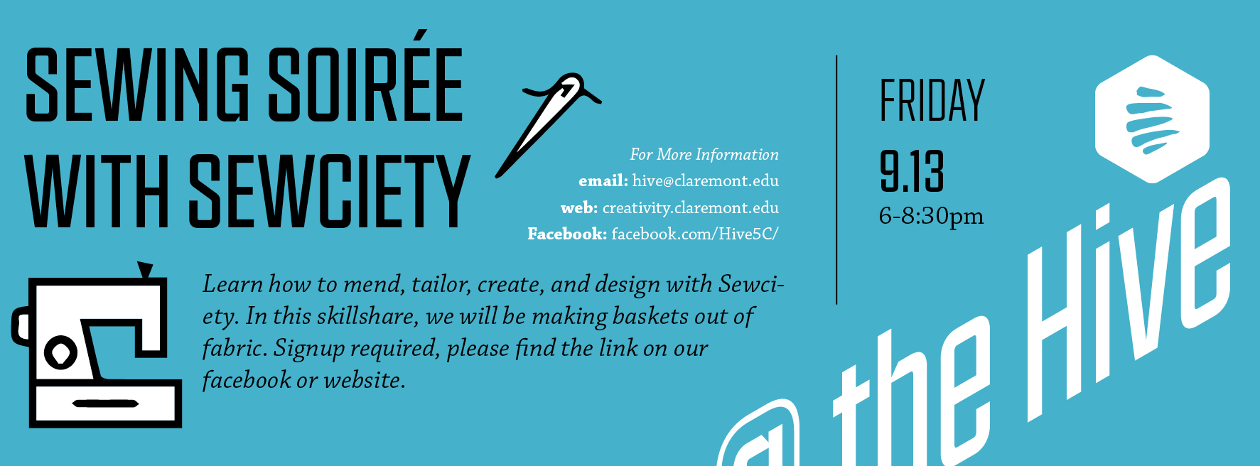 We will be kicking off a whole semester of sewing skill shares with the Sewing Soirée. Walk away with personalized hand-sewn totes and bags for those extra books!