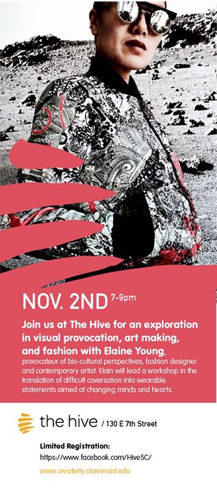 Join us at The Hive for an exploration in > visual provocation, >> art making, and >>> fashion with >>>> Elaine Young, provocateur of bio-cultural perspectives, fashion designer and contemporary artist. Elain will lead a workshop in the translation of difficult coversation into wearable statements aimed at changing minds and hearts. You will leave this […]
